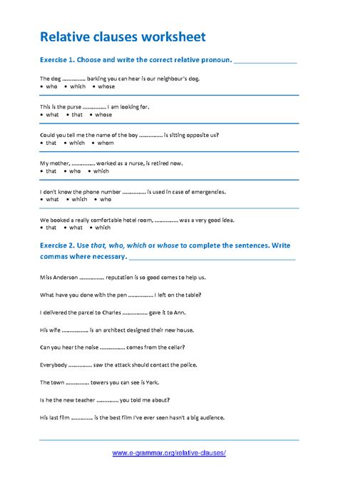 Relative Clauses Exercises / Relative Clauses Worksheet E Grammar : Thanks martin phillips for clipart.. She worked for a man. 1 i think that my boss is the person who i admire most. Free interactive exercises to practice online or download as pdf to print. That's the man who lives next door to us. The sentence in italics should become the relative clause.